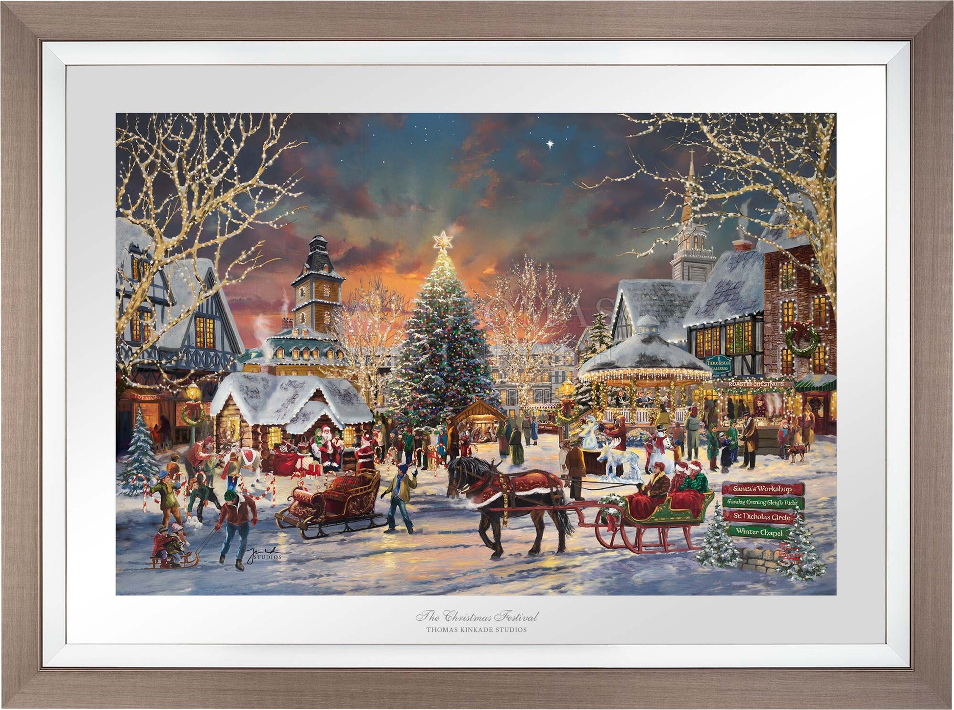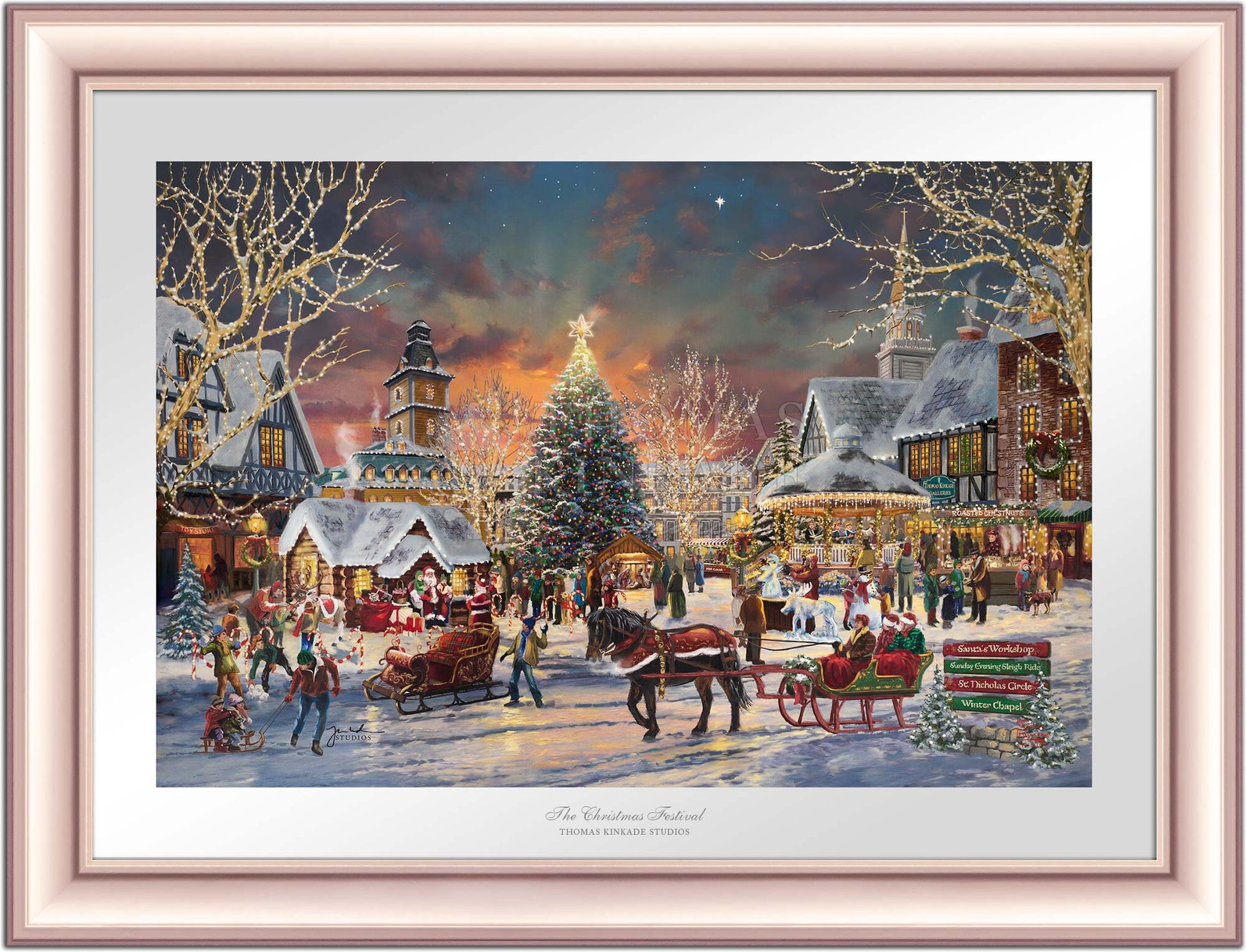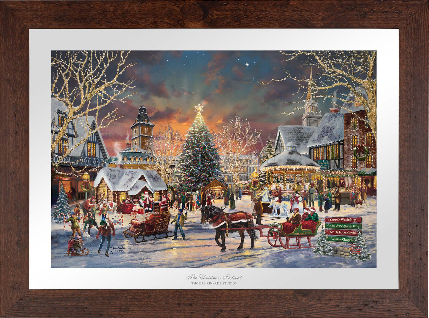 Call Us“Of all the holiday rituals, the one I prize the most is the coming together of loved ones in shared celebration.” – Thomas Kinkade A bright Christmas star illuminates the evening sky as young and old gather to begin celebrating the Christmas season. Santa has taken his seat, and excited children wait in line with their parents and grandparents to have their turn telling Santa what they would love for Christmas. As you walk around the town square one can enjoy the melodic sounds of the Christmas Carolers in the brightly decorated gazebo. Maybe have a cup of hot cocoa or a bag of roasted chestnuts while watching the ice sculptor create a cool icy version of one of Santa’s reindeer. The Thomas Kinkade Studios invites you to join us for the first day of The Christmas Festival.