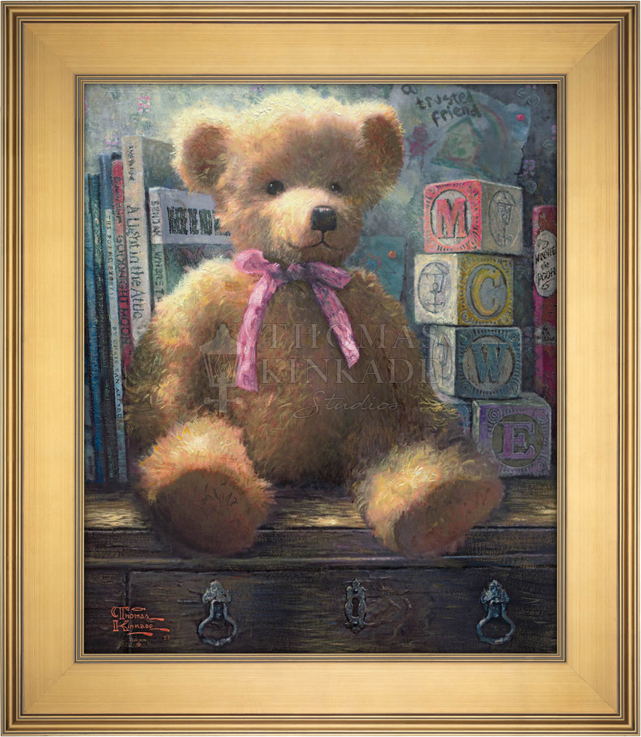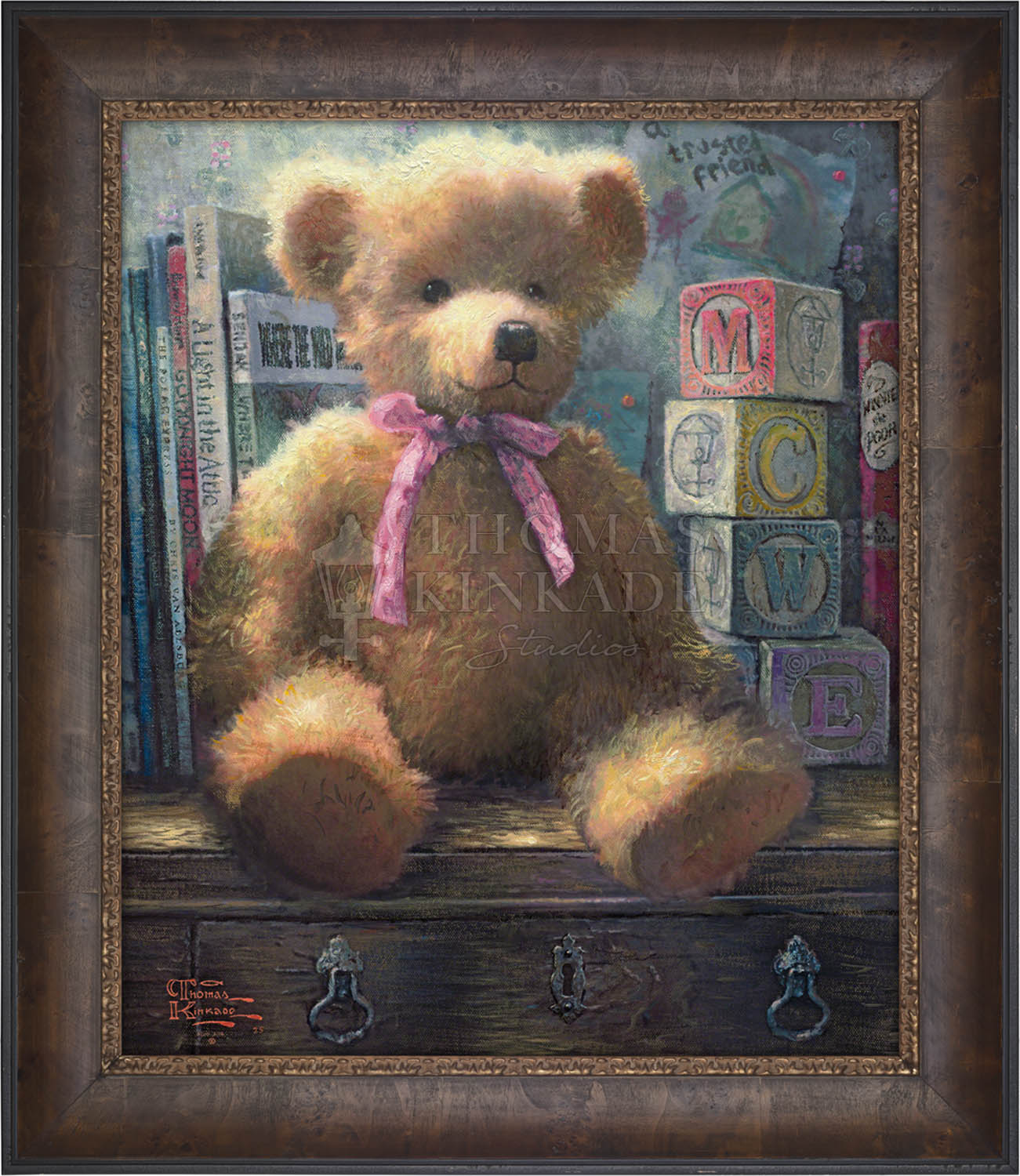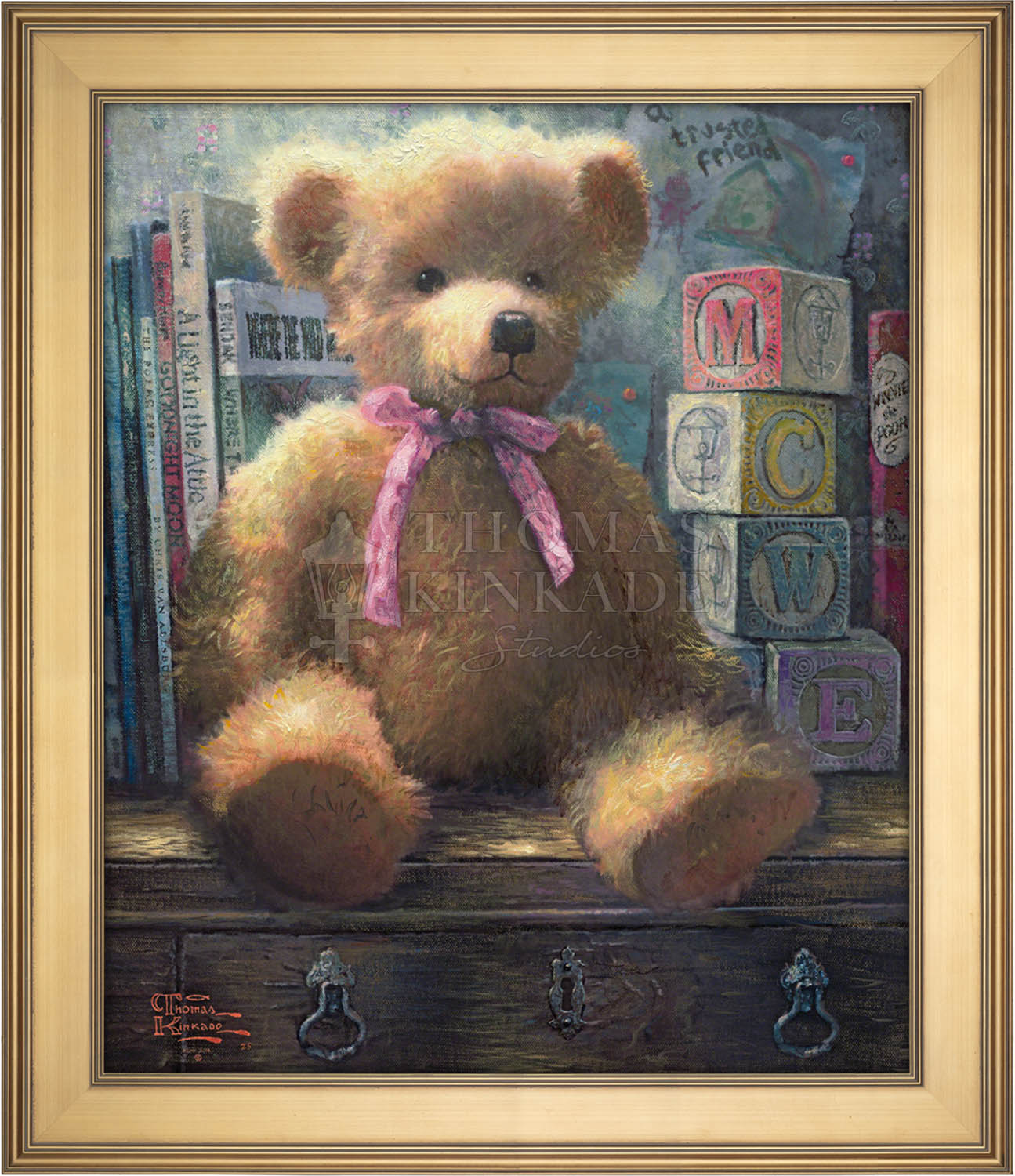 My painting A Trusted Friend celebrates the imagination of childhood which can make even an inanimate object come to life with love. This is my first ever teddy bear painting, and as I worked on it I was reminded of the passion displayed by teddy bear collectors worldwide. These collectors remind us that even for adults a teddy bear can be A Trusted Friend, and perhaps my painting will be a daily reminder of this happy fact. I even added a special touch: you can have your choice of a pink ribbon for girl bears or a blue one for boy bears. That way, your very own "trusted friend" can be even more personal to you!