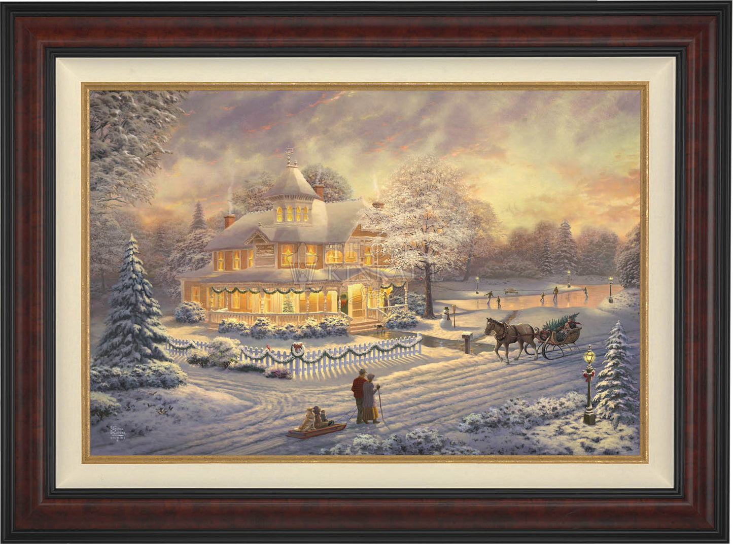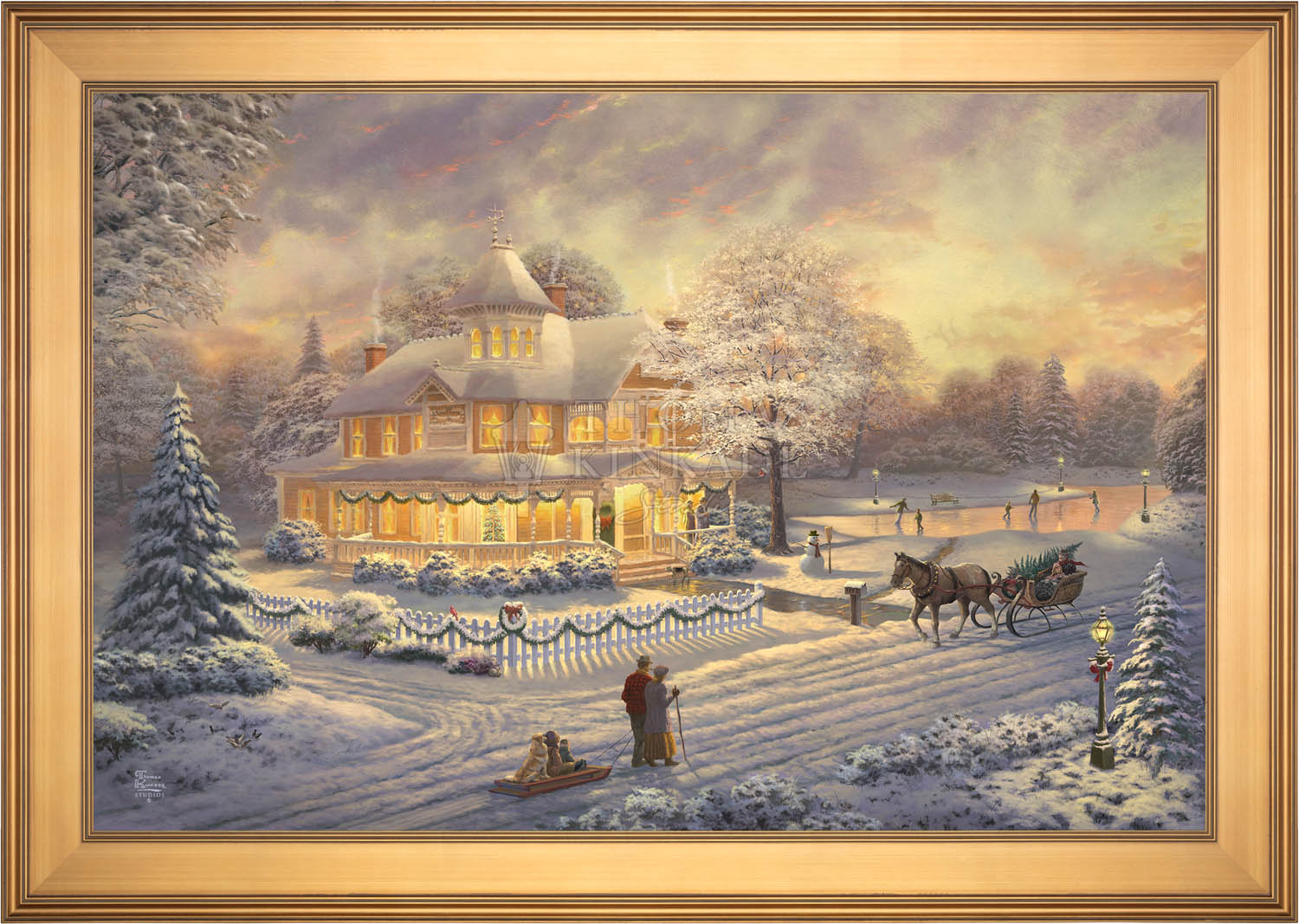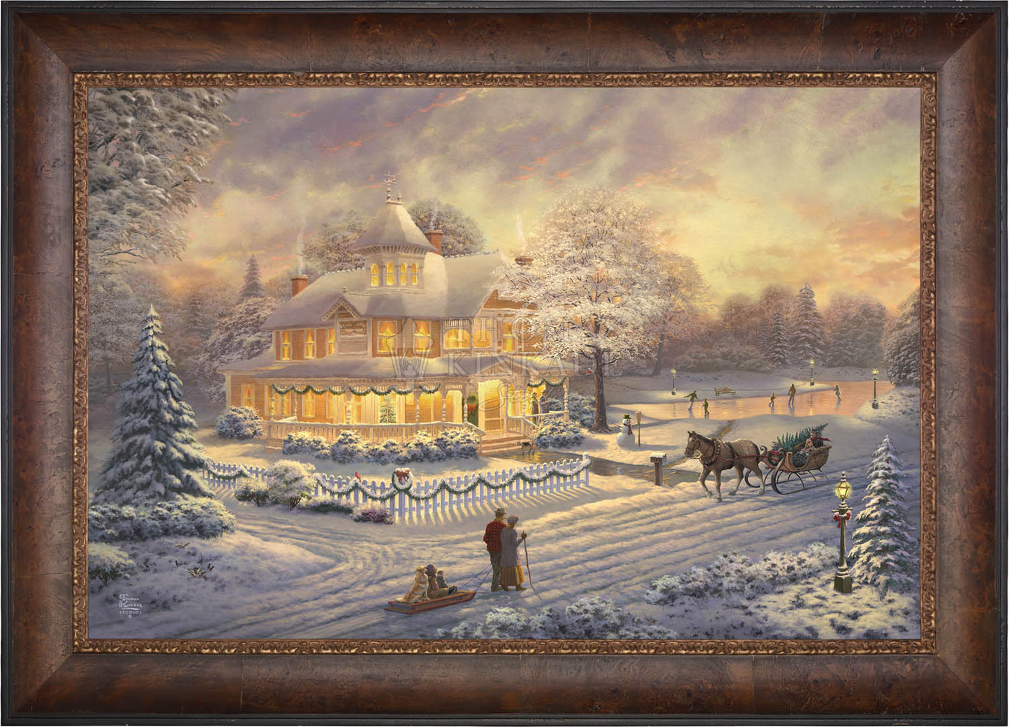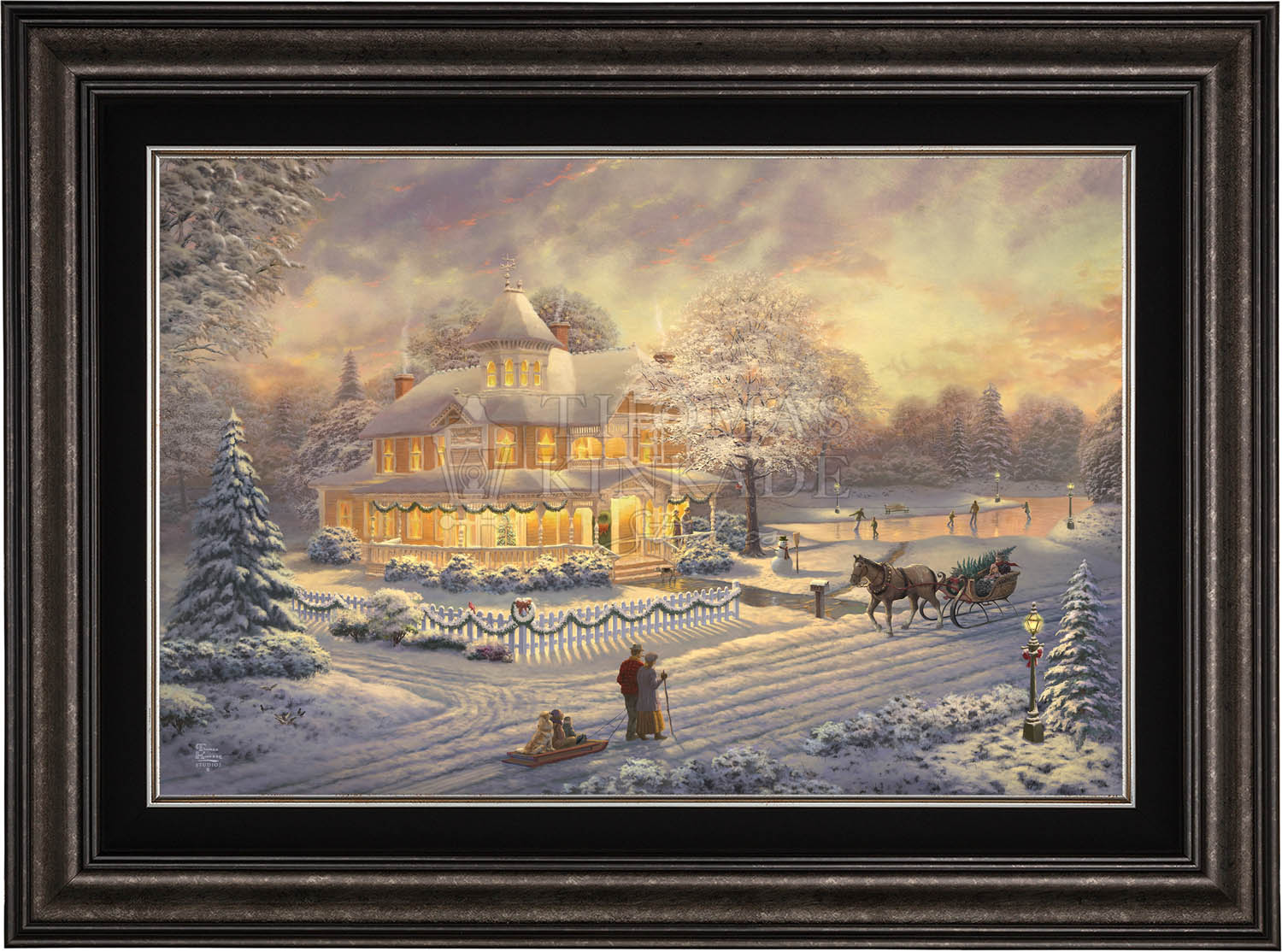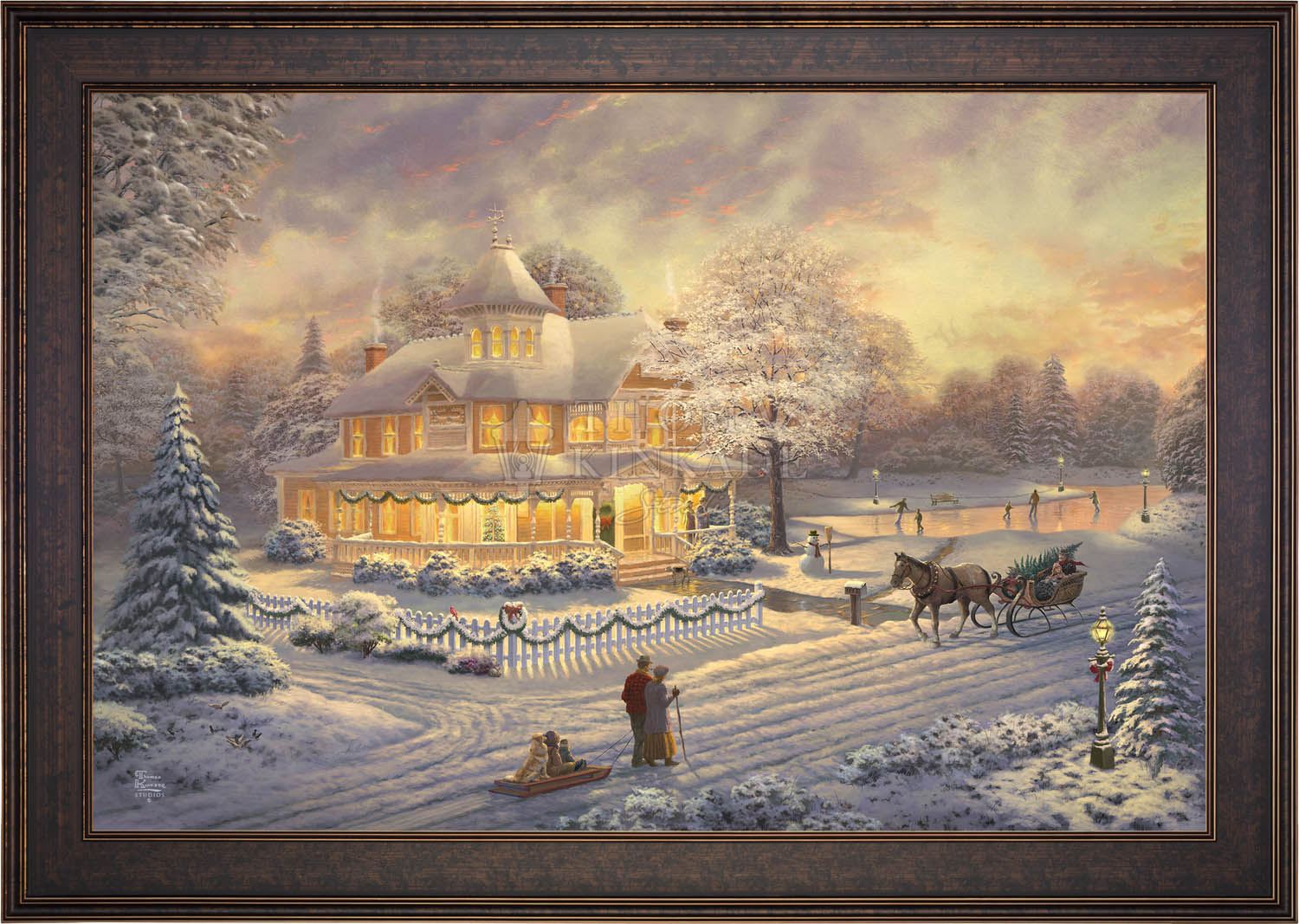 Come one, come all to our winter party! The snowman invites you to join the other guests on the skating pond. Or would you prefer to sit on the bench and watch the merriment? With the crispness in the air, you may want to enjoy a warm mug of hot chocolate on the porch. Our newest painting, Victorian Christmas Sunset, pays tribute to Thom’s beloved Victorian Christmas series. It offers you all these possibilities, and there is a guarantee that everyone will enjoy the colorful winter sunset.