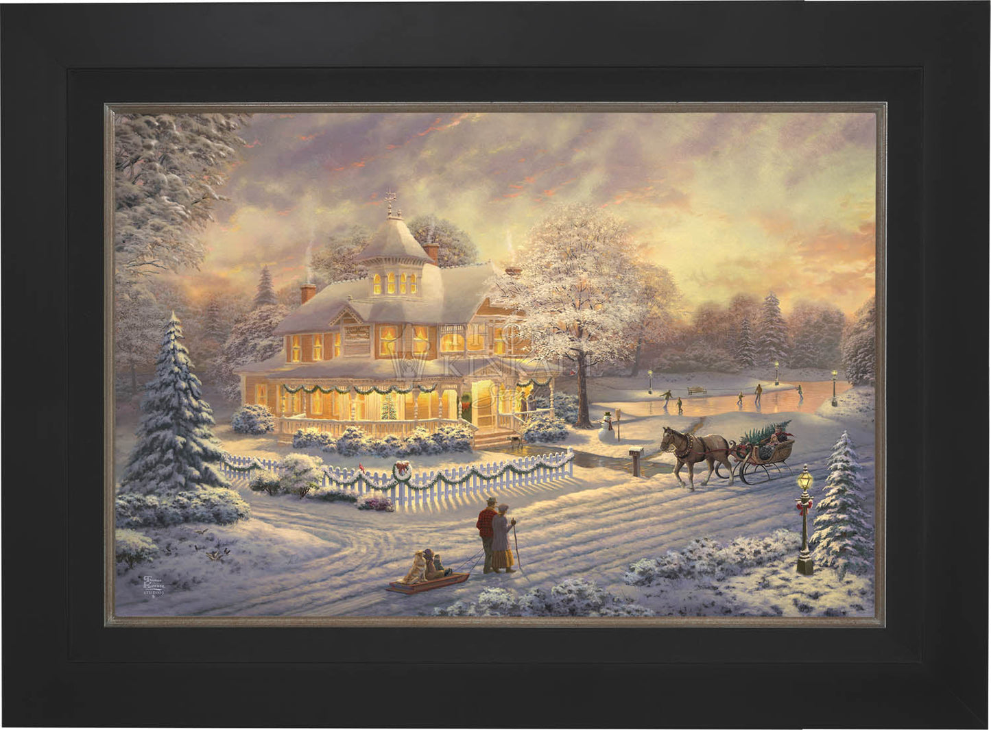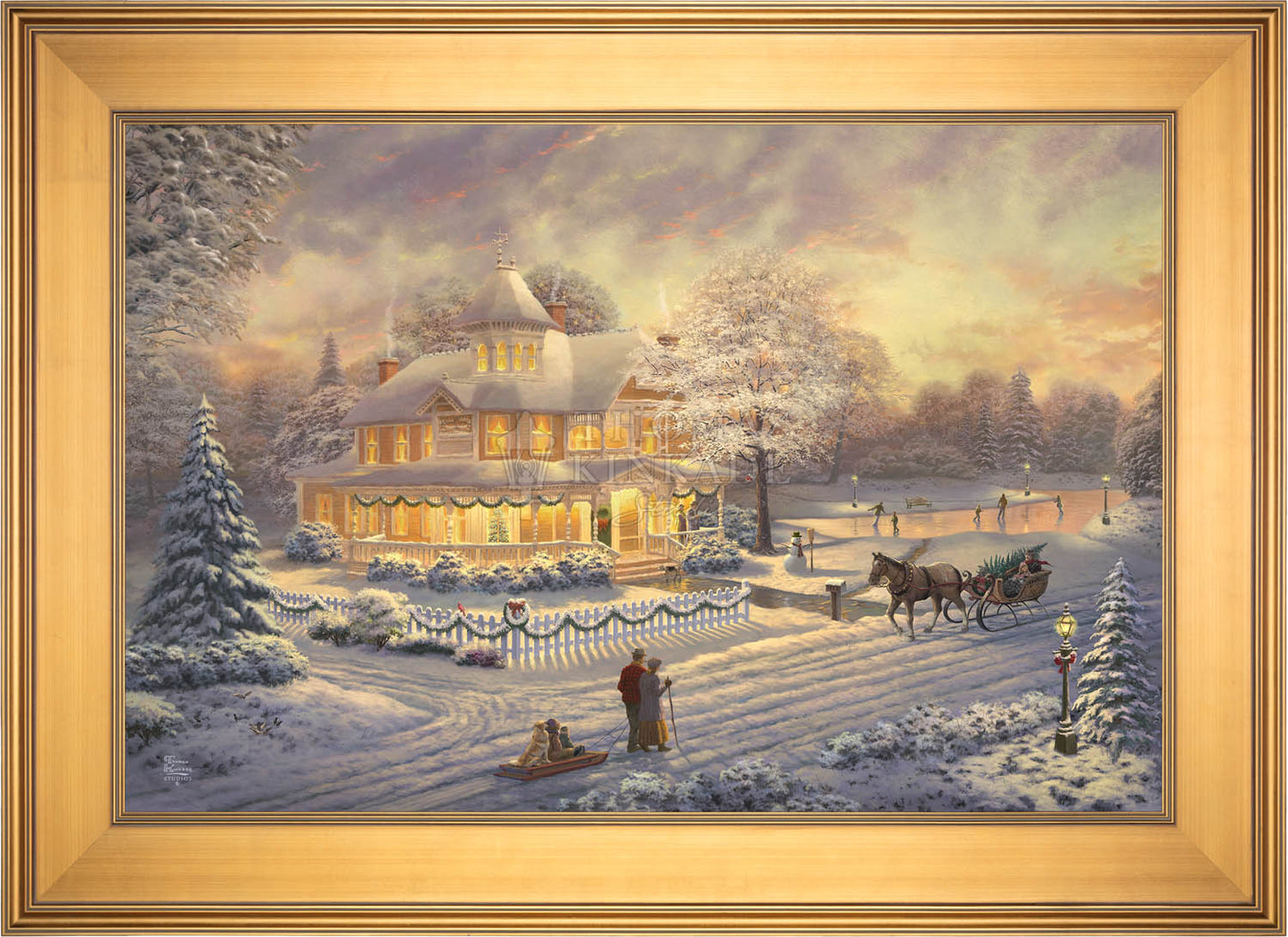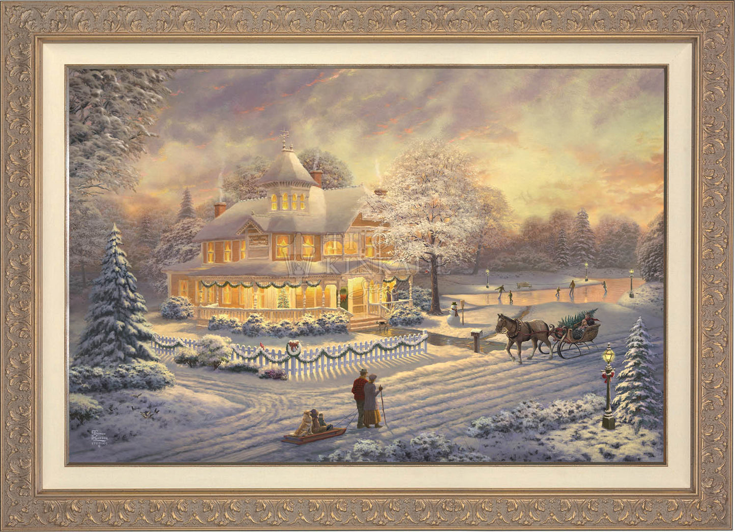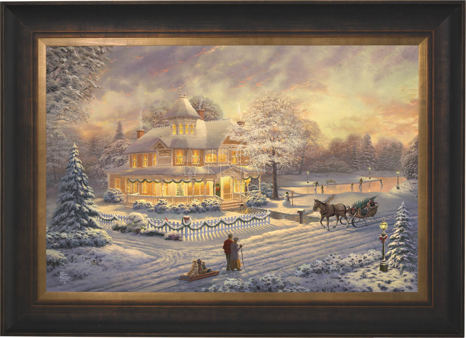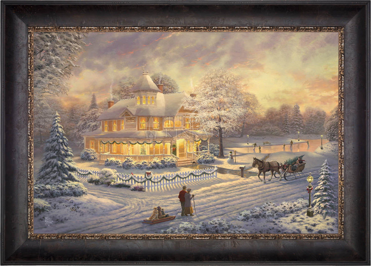 Come one, come all to our winter party! The snowman invites you to join the other guests on the skating pond. Or would you prefer to sit on the bench and watch the merriment? With the crispness in the air, you may want to enjoy a warm mug of hot chocolate on the porch. Our newest painting, Victorian Christmas Sunset, pays tribute to Thom’s beloved Victorian Christmas series. It offers you all these possibilities, and there is a guarantee that everyone will enjoy the colorful winter sunset.