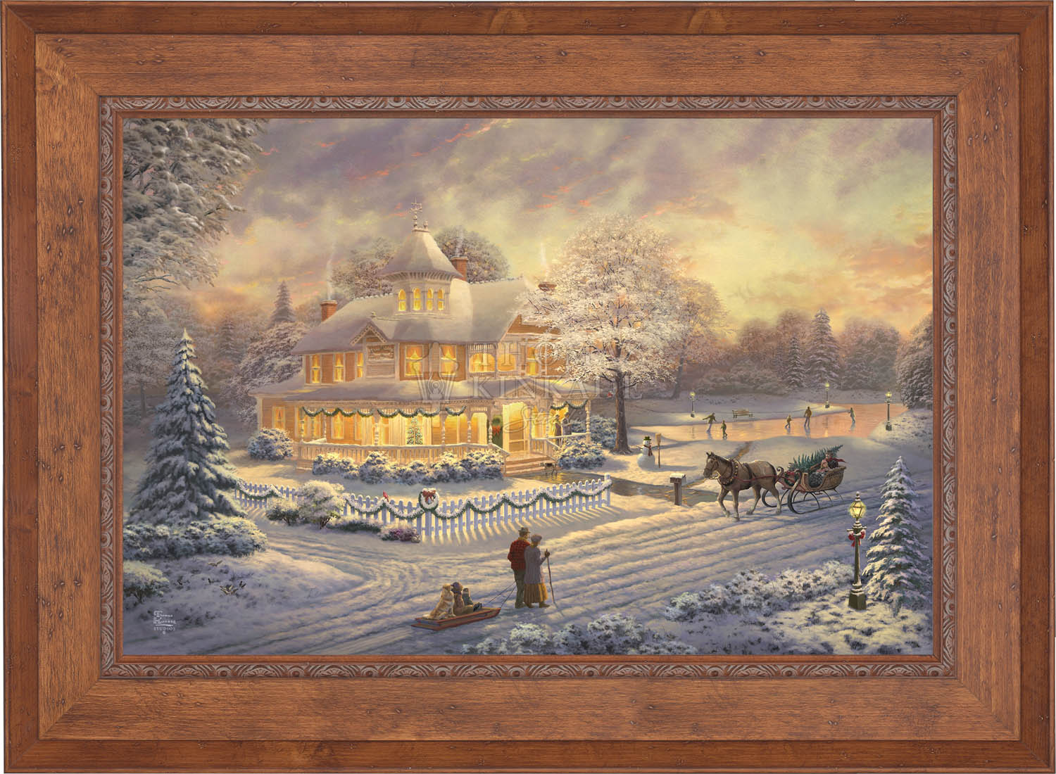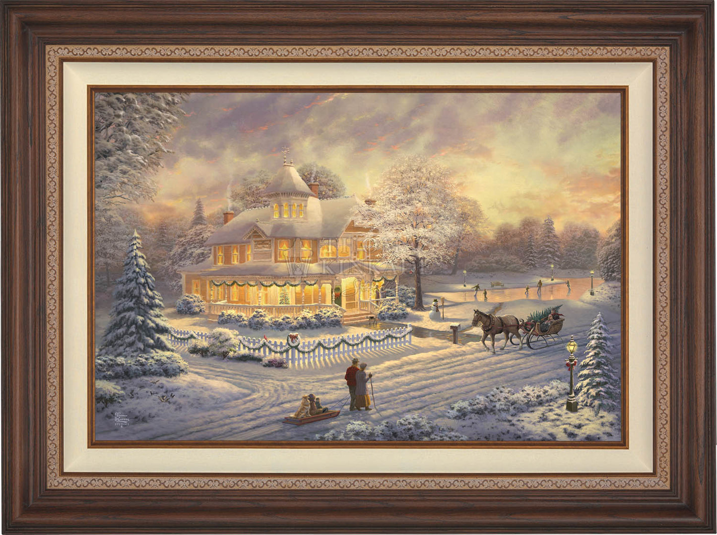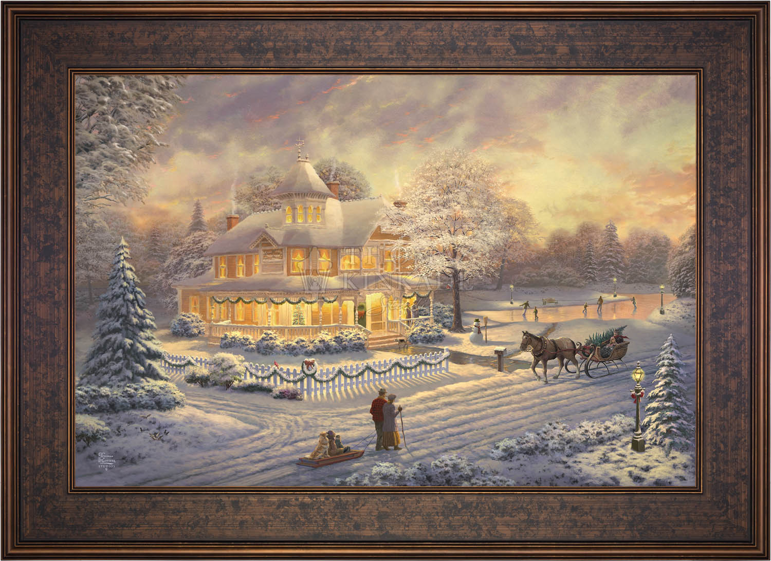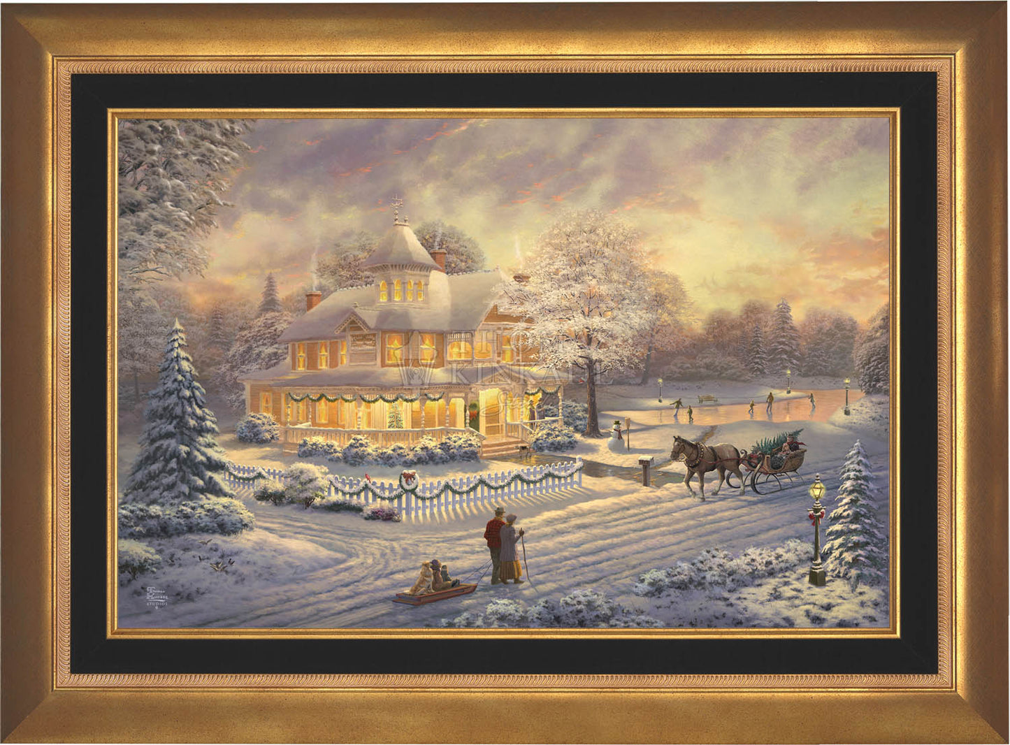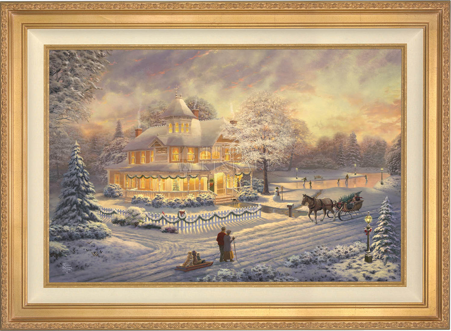 Come one, come all to our winter party! The snowman invites you to join the other guests on the skating pond. Or would you prefer to sit on the bench and watch the merriment? With the crispness in the air, you may want to enjoy a warm mug of hot chocolate on the porch. Our newest painting, Victorian Christmas Sunset, pays tribute to Thom’s beloved Victorian Christmas series. It offers you all these possibilities, and there is a guarantee that everyone will enjoy the colorful winter sunset.