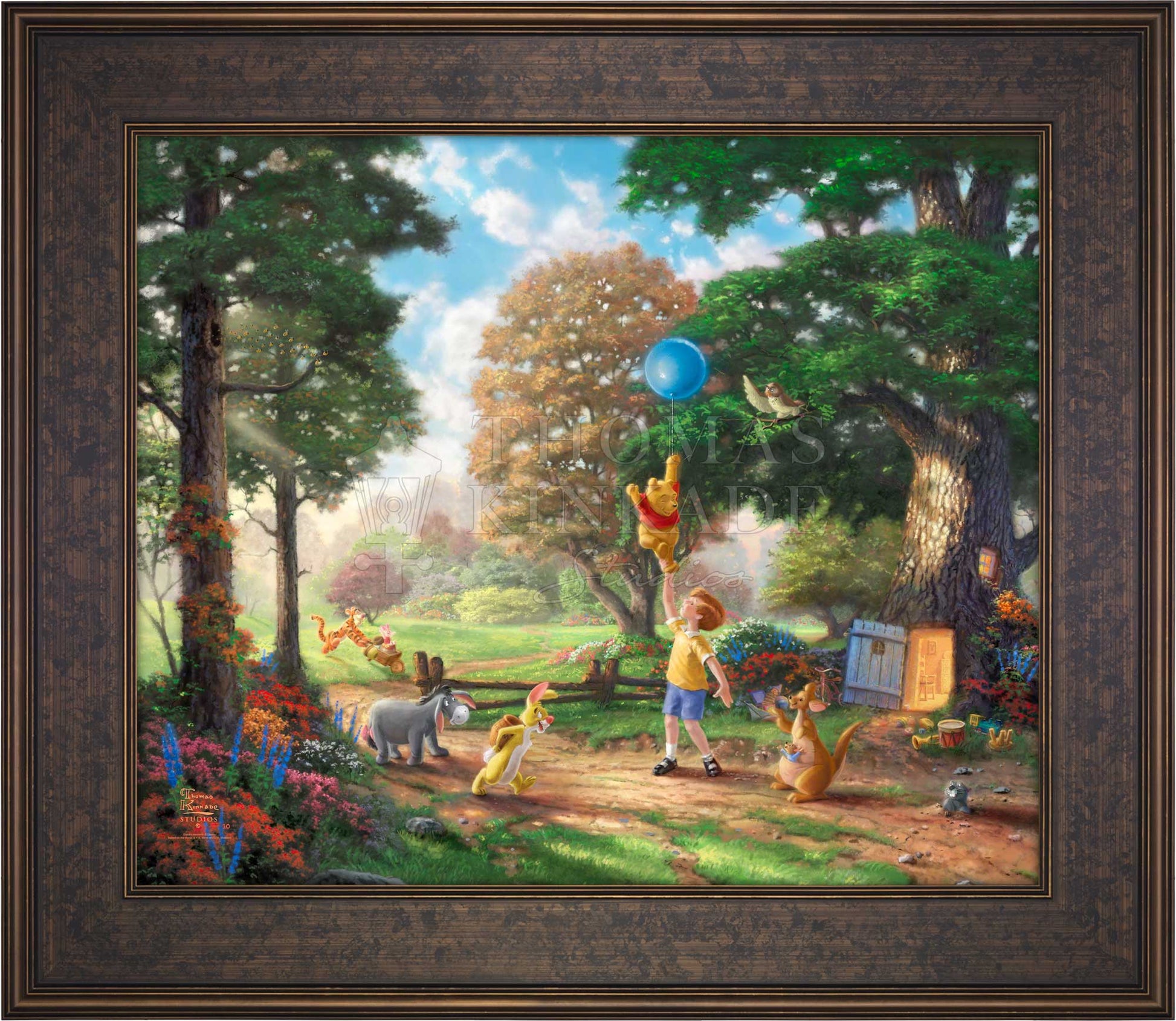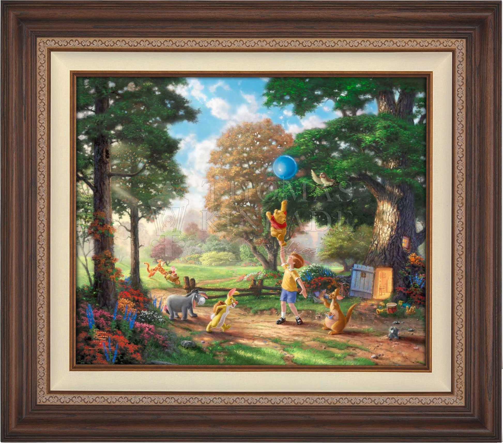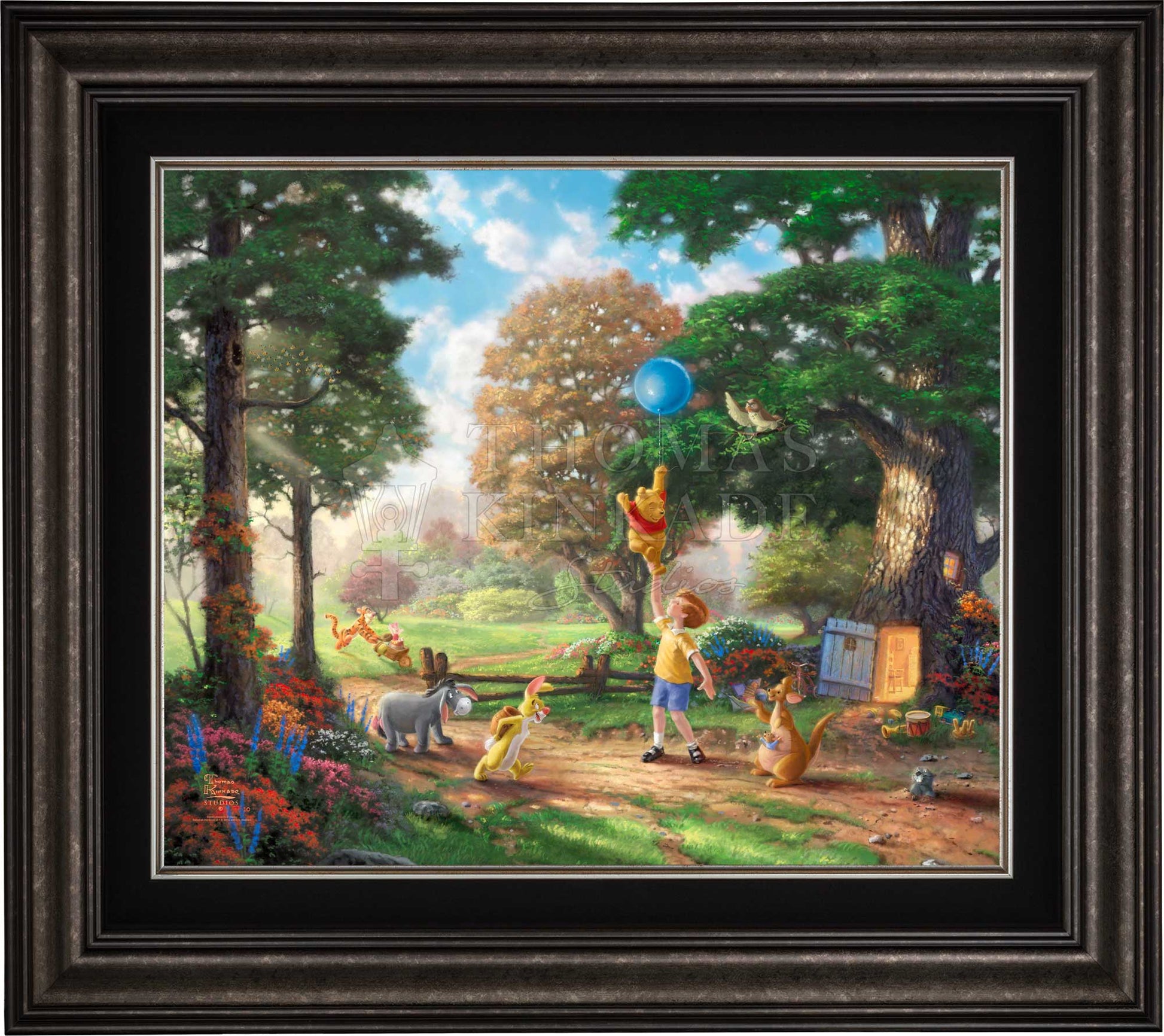 There are few if any works of literature or animation that better capture the innocence and wisdom of the child and the child's perspective on life than the A. A. Milne classic "Winnie the Pooh". There were few if any books or films that influenced Thom as a young boy more than these stories detailing the adventures of Christopher Robin and his delightful menagerie of friends as they all adventured in the Hundred Acre Wood. In 1966 when Disney Studios began releasing their featurettes chronicling these wondrous tales, Thom could not have been more excited. His childhood fancies were coming to life. It is in honor of that time in his life we at the Thomas Kinkade Studios proudly introduce scenes from this magical story of love, faith, friendship and adventure. It is in these paintings we hope our collectors reflect on and always remember these undeniable truths from Pooh himself, such as "nobody can be uncheered with a balloon" or "when you see someone putting on his Big Boots, you can be pretty sure that an adventure is going to happen."