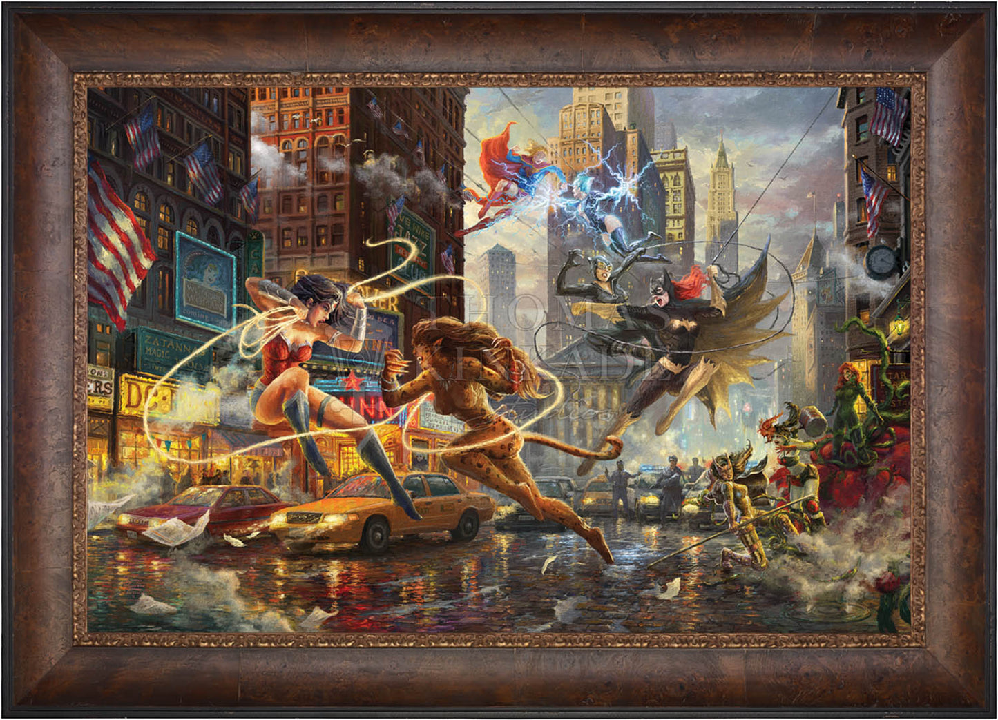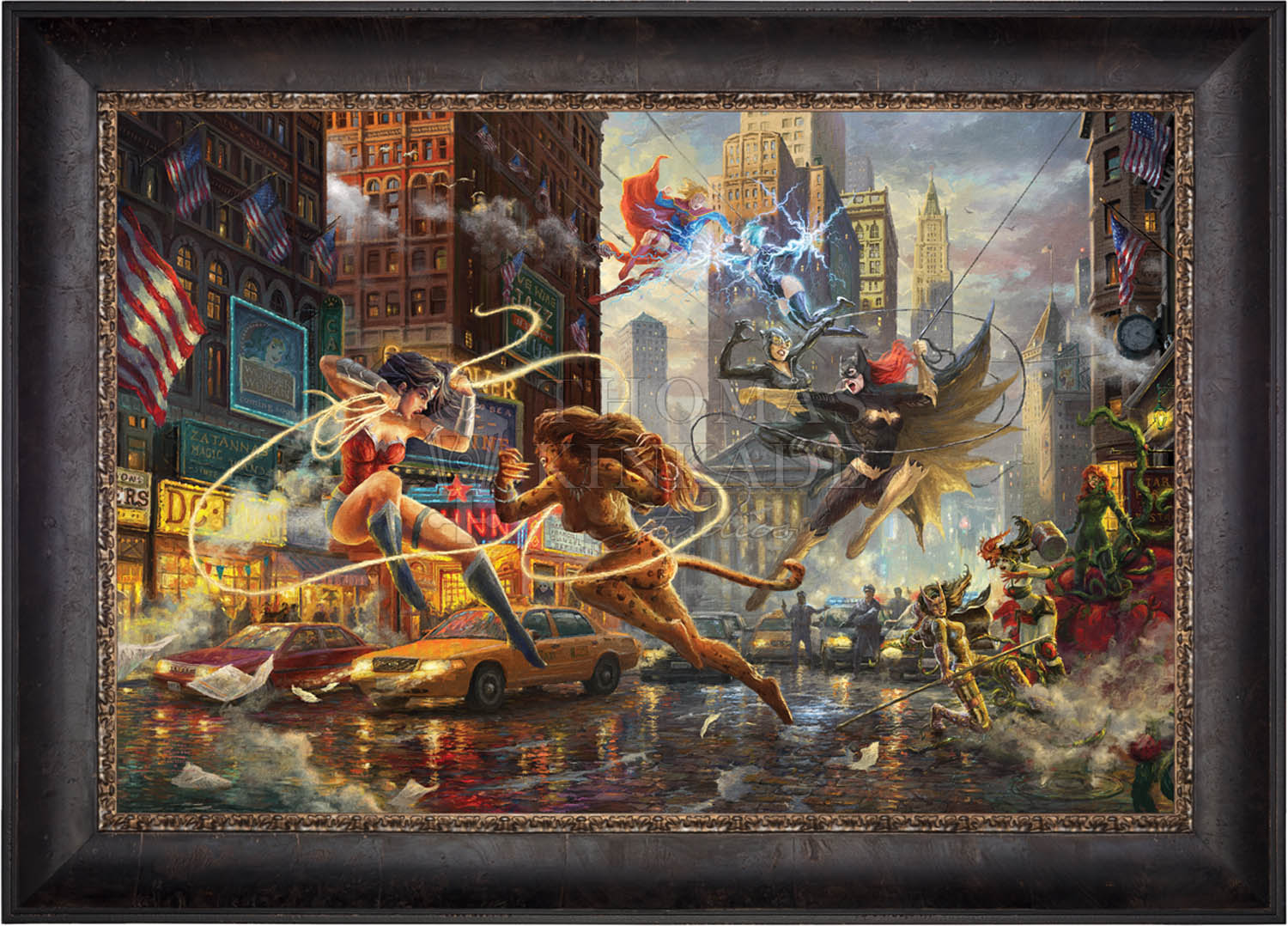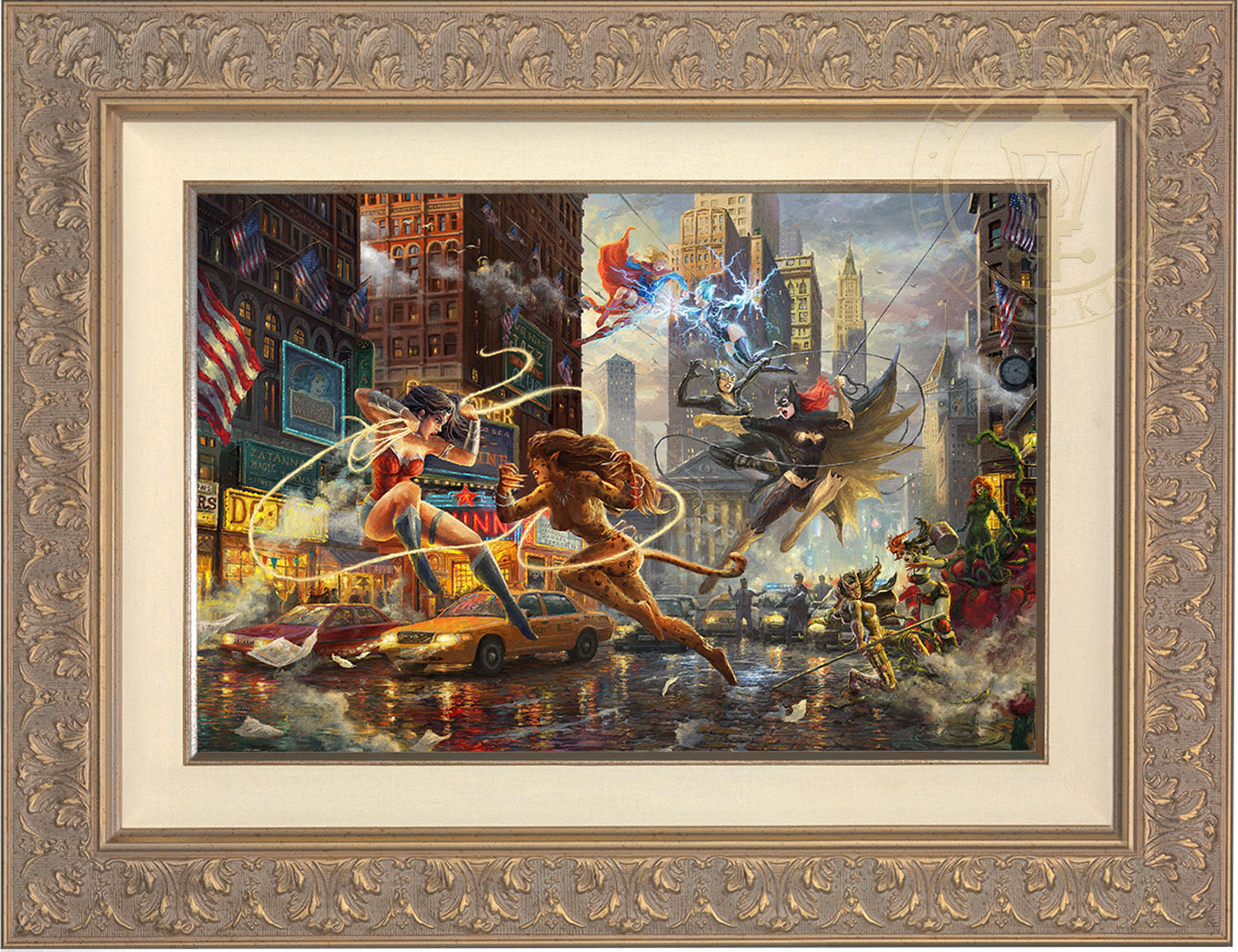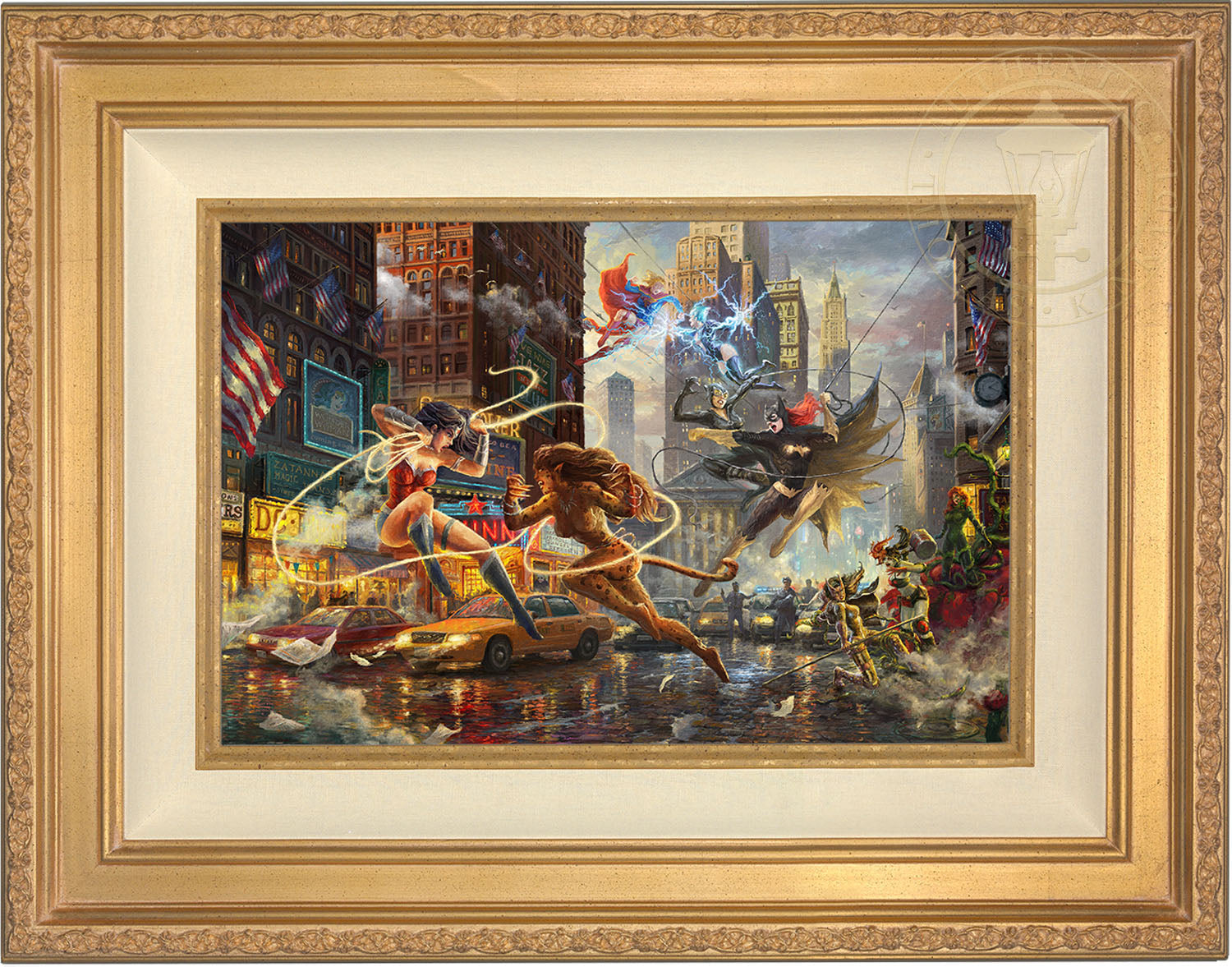 Brace yourself for a high-energy collision! Thomas Kinkade Studios chronicles the action-packed encounter between some of the world’s most beloved female Super Heroes and their adversaries, all in one dramatic scene - The Women of DC. As the city’s local police force stands helplessly watching, conflict ensues. The Women of DC blends the Kinkade-style of warmly lit storefronts and glossy streets, with DC’s electric line up, to produce a dynamic collector’s piece.