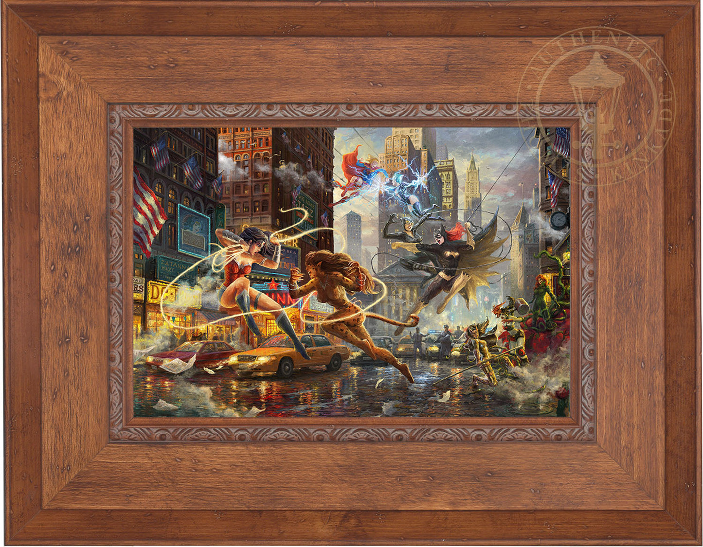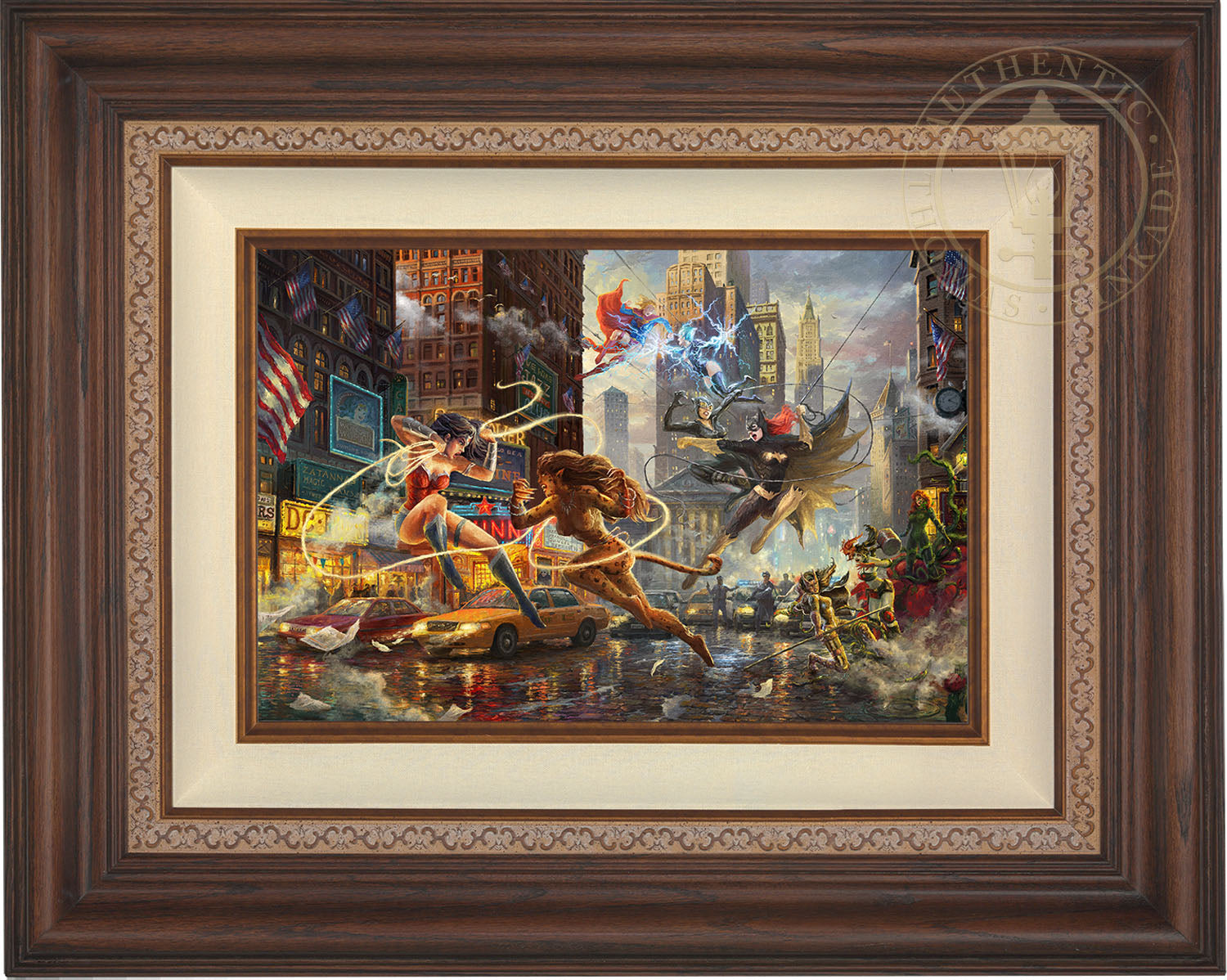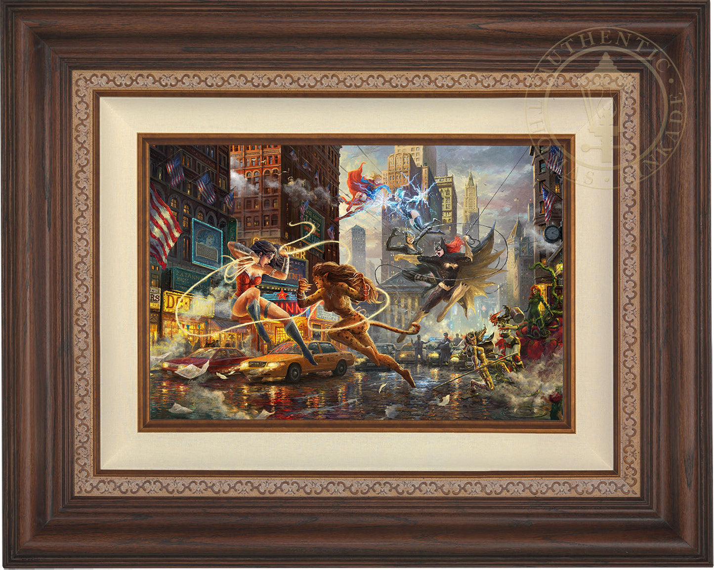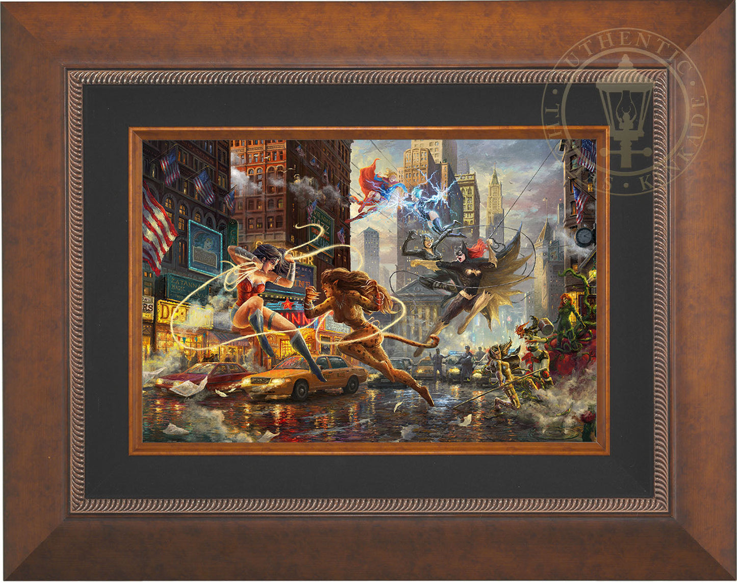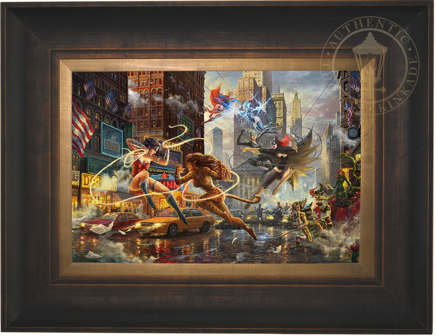 Brace yourself for a high-energy collision! Thomas Kinkade Studios chronicles the action-packed encounter between some of the world’s most beloved female Super Heroes and their adversaries, all in one dramatic scene - The Women of DC. As the city’s local police force stands helplessly watching, conflict ensues. The Women of DC blends the Kinkade-style of warmly lit storefronts and glossy streets, with DC’s electric line up, to produce a dynamic collector’s piece.