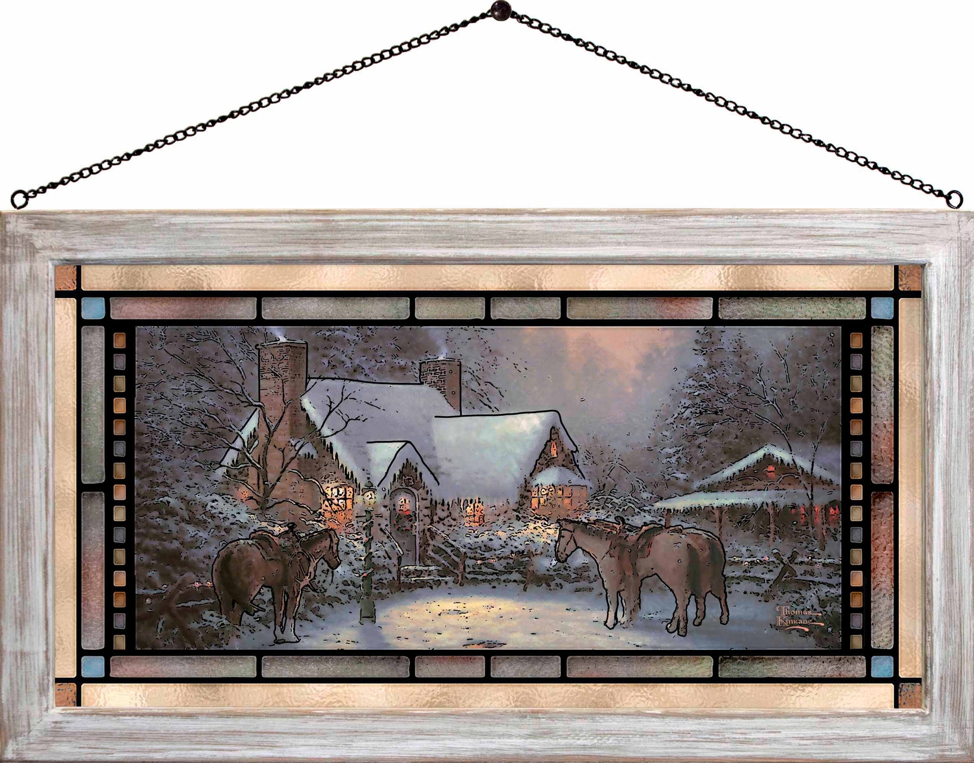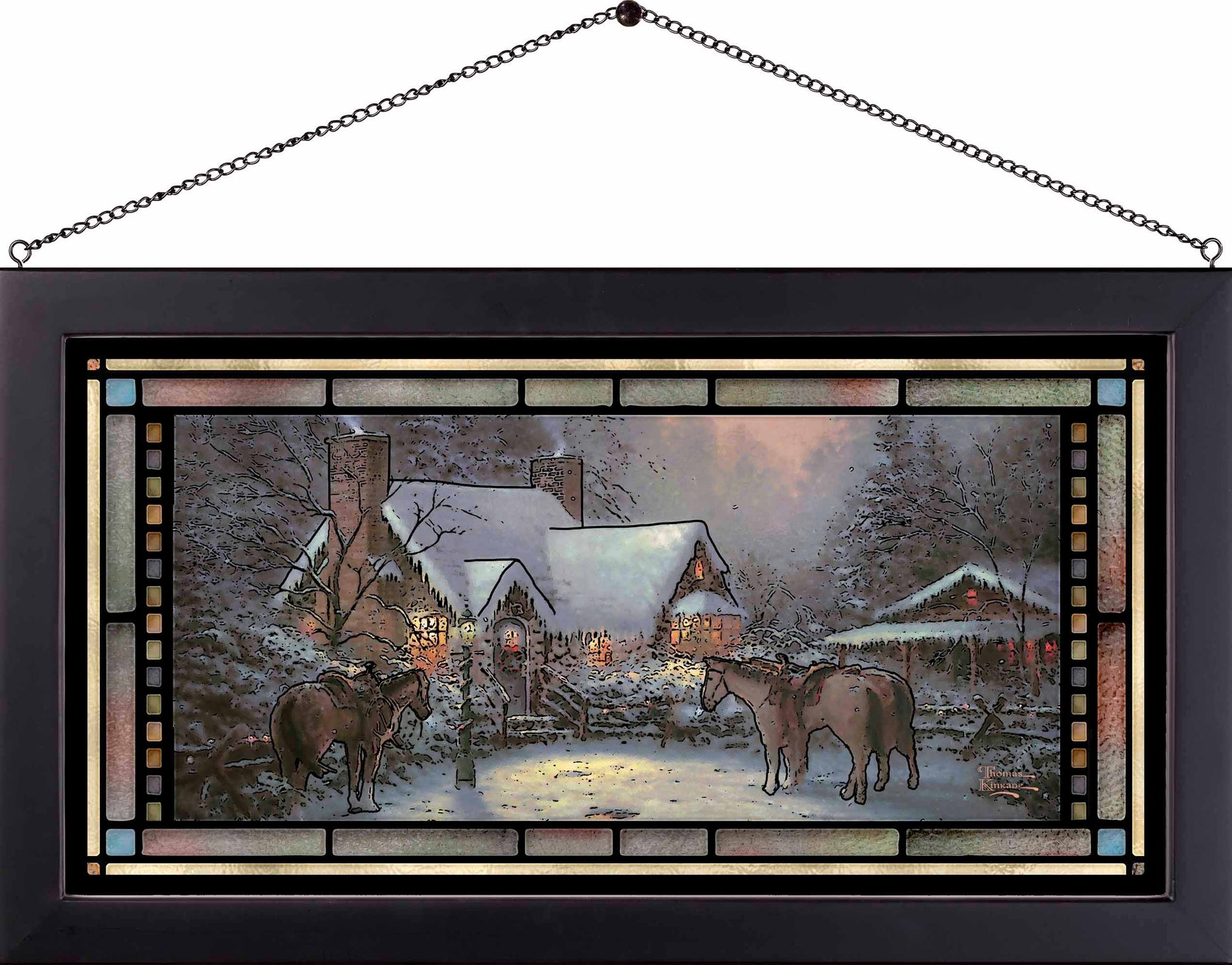 Let the light shine! Stained glass art hangings show their true colors when back-lit with natural sunlight. Popular designs are printed with fade resistant inks on 11" x 21" glass, framed with 1" black-finished moulding. Framed size 13" x 23". Ready to hang with provided chain. Designed, printed, and assembled in North America.